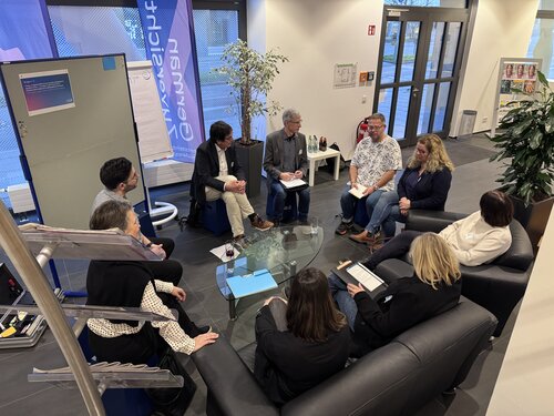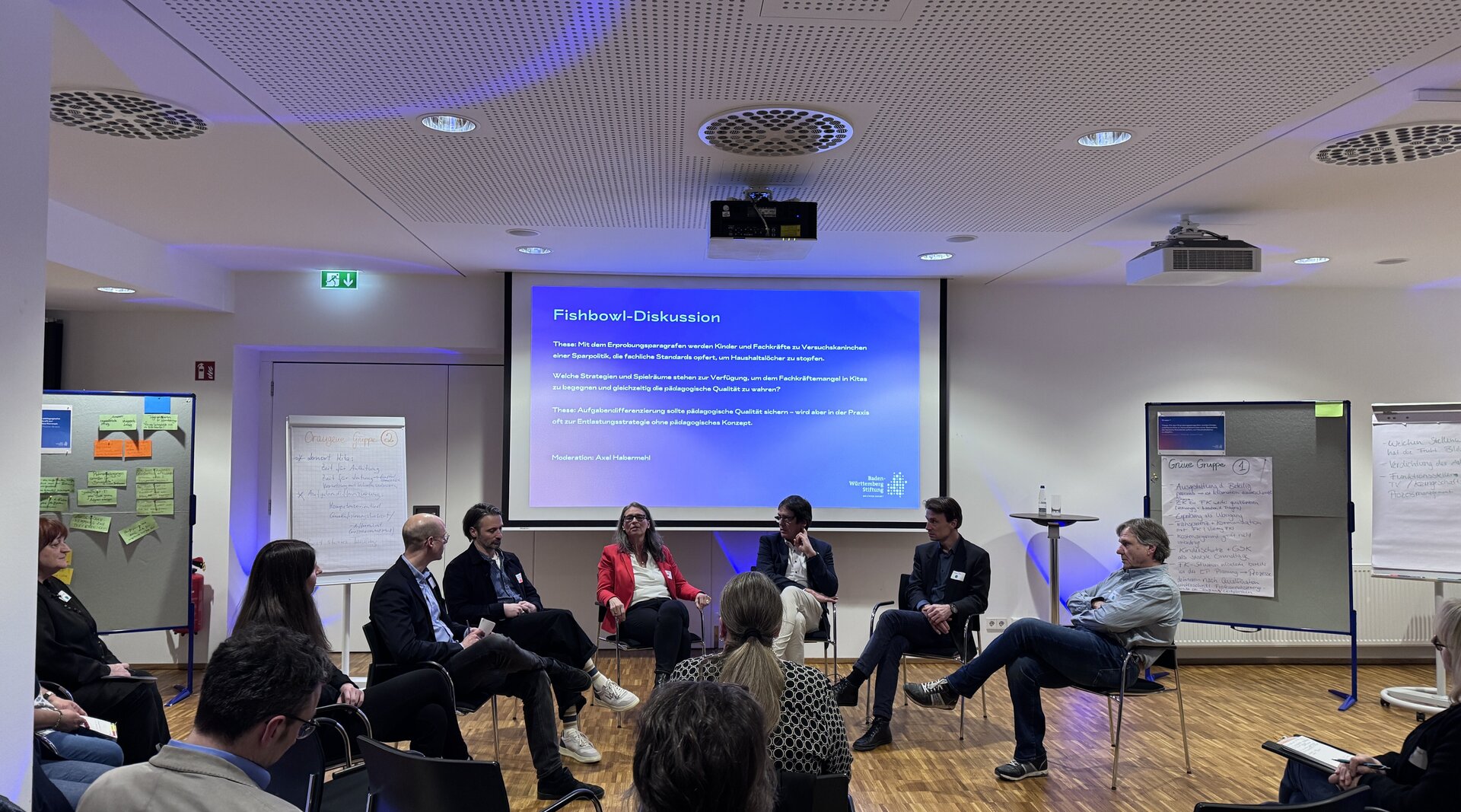 Die Themen aus den drei Gruppen werden anschließend gemeinsam im Fishbowl-Format diskutiert: Eine Person aus jeder Gruppe bringt die Ergebnisse in die moderierte Diskussion ein. Neben den festen Sitzplätzen lädt ein frei gehaltener Stuhl das Publikum dazu ein, sich jederzeit in die Diskussion einzubringen, damit möglichst viele Beteiligte mitreden können.